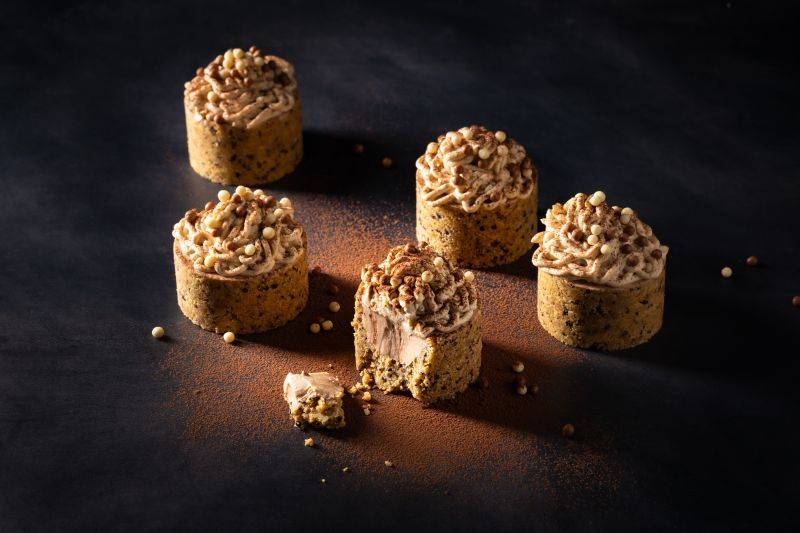 A Callebaut 823 milk chocolate cheesecake featuring a crunchy biscuit and cocoa nib base, a smooth Callebaut W2 white chocolate centre topped with a delicious coffee cream ganache. This is a really easy cheesecake to make but made more premium with a cocoa nib base, coffee cream ganache and Salted Caramel Crispearls as the final touch!