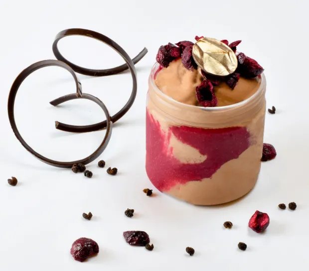 A perfectly balanced combination of creamy chocolate, sour cherry and peper for a new and twisted experience of ice cream.