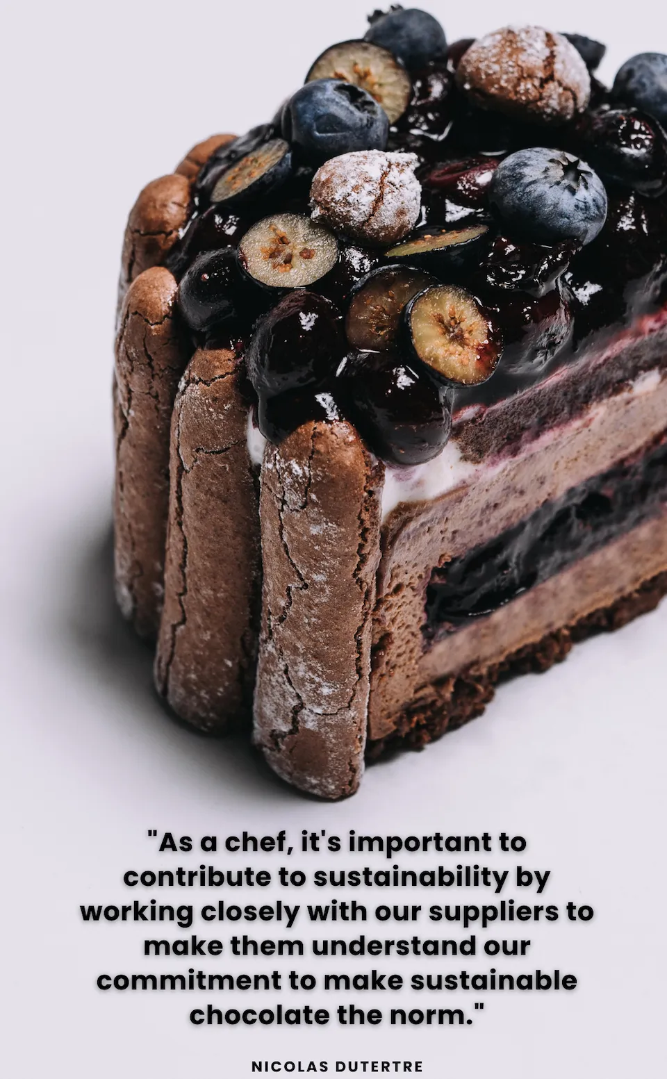 His exclusive dessert for the magazine was a Chocolate Charlotte, in which he used upcycled macaron shells, local fruit and flowers, and Evocao Chocolate.