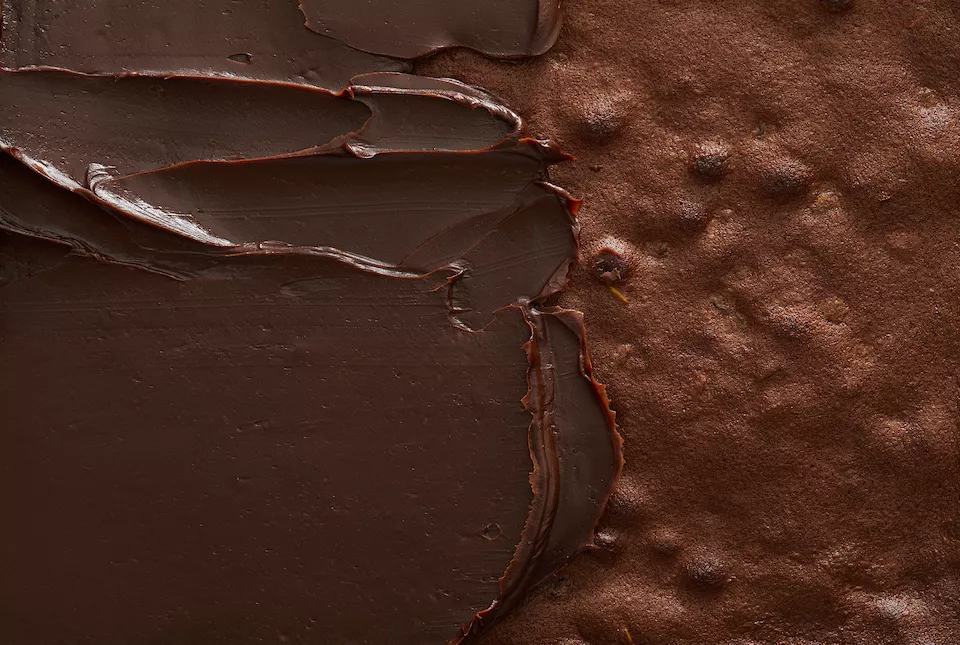 Chocolate brownie with ganache spread over half